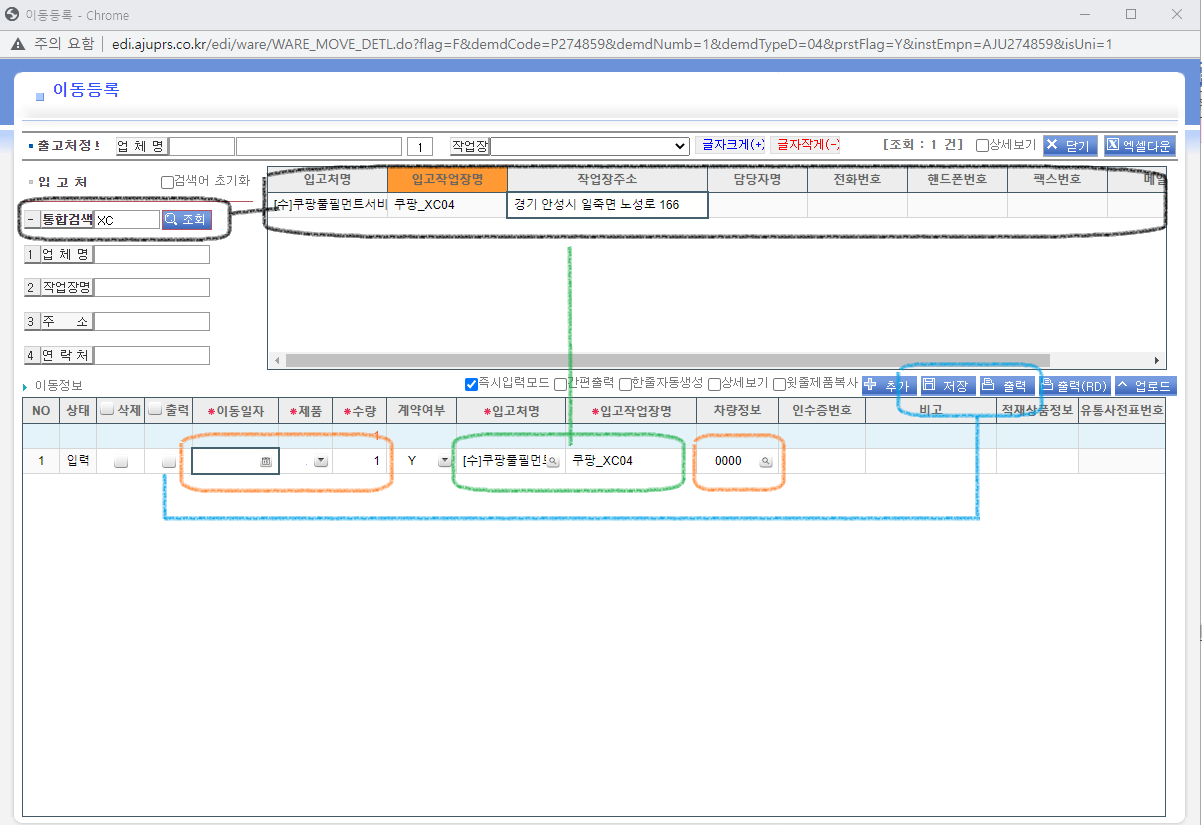 ※ 입고작업장명,주소, 담당자 등은 기존 AJ에 기입된 정보를 토대로 노출됩니다.