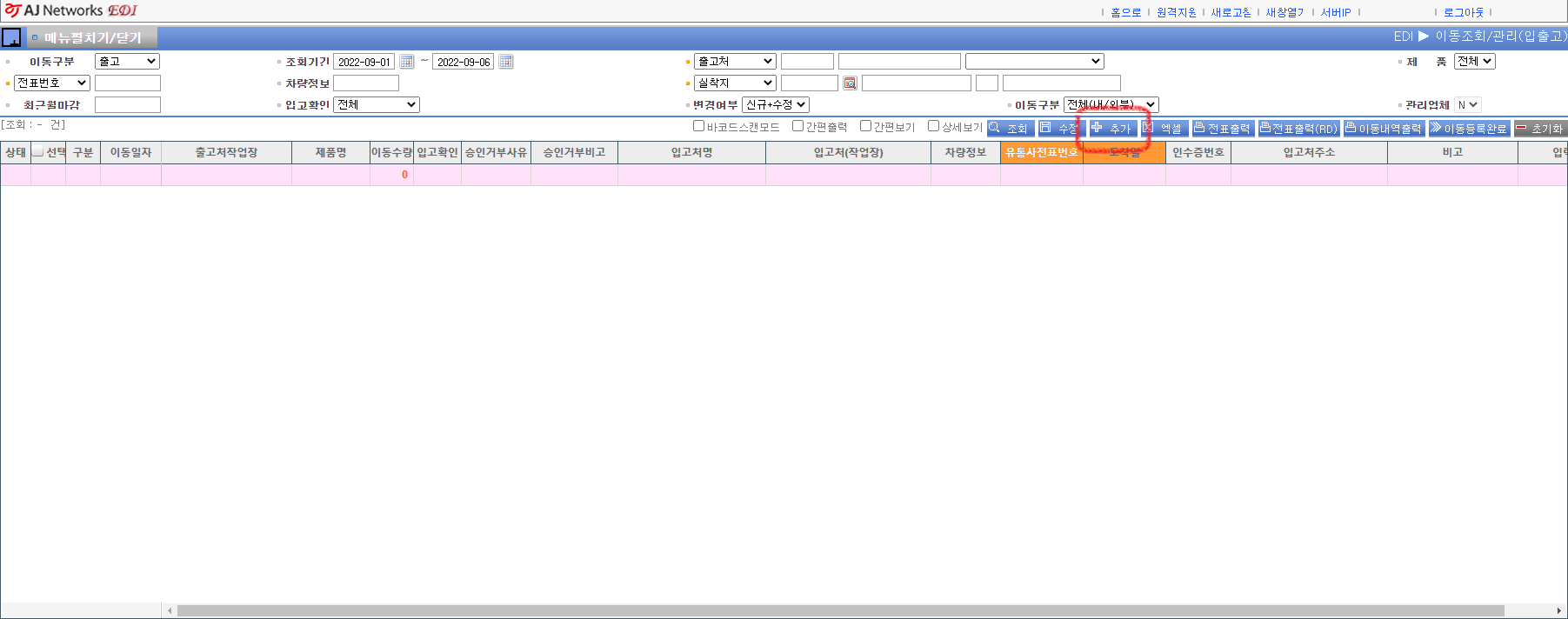접속 후 메뉴 펼치기 - 이동조회/관리(입출고) 클릭